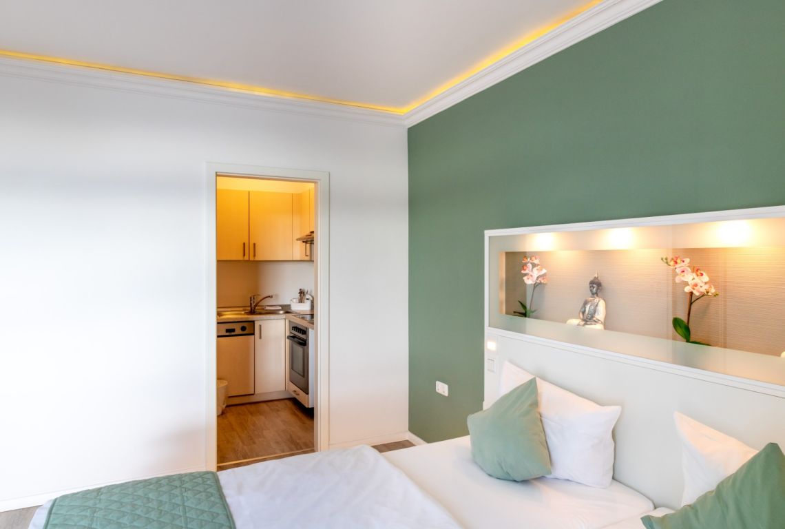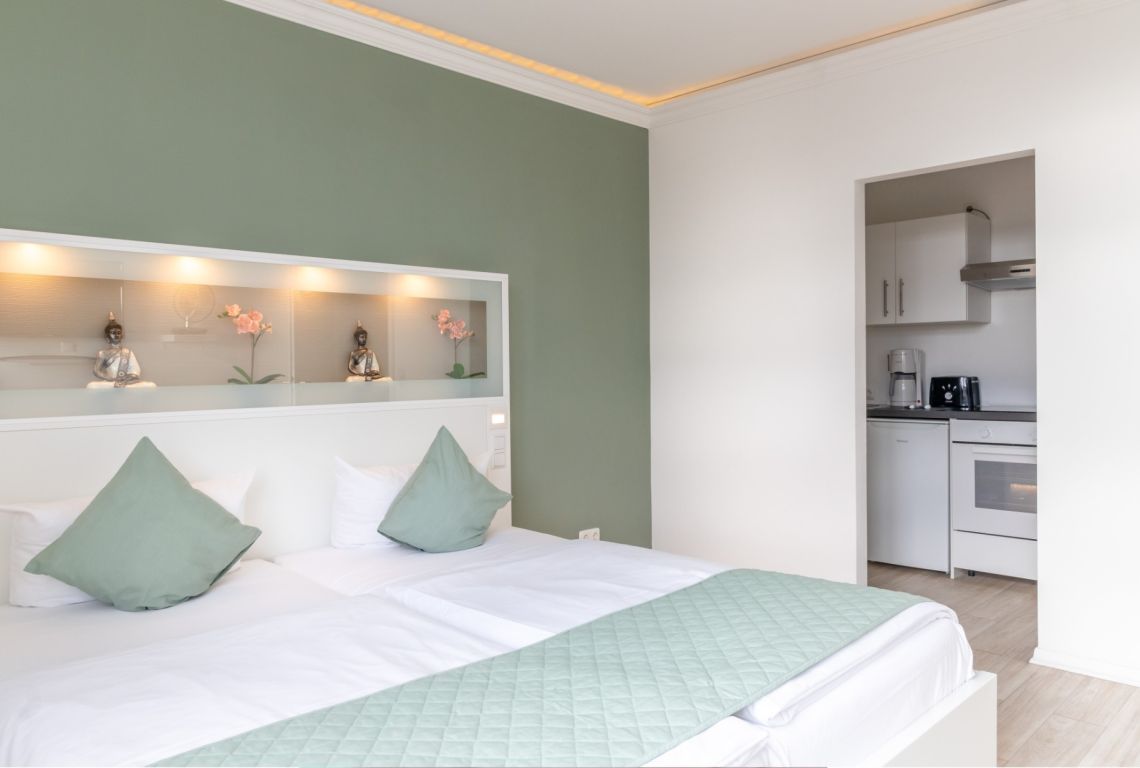 Unsere Appartement Plus sind ausgestattet mit einem bequemen, 1,80 m breiten Doppelbett (zwei einzelne Matratzen),