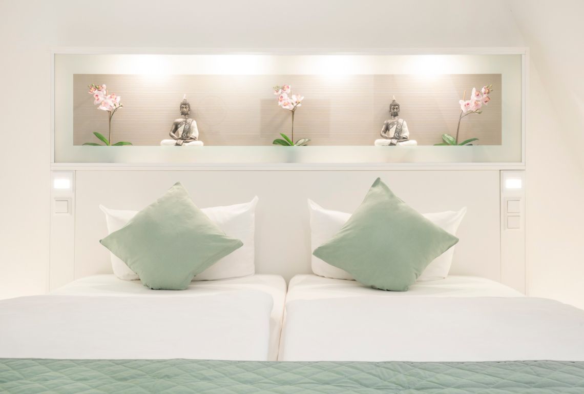 Das stimmige Farbkonzept – frisches Grün und klares Weiß – in den Zimmern sorgt für eine ruhige und