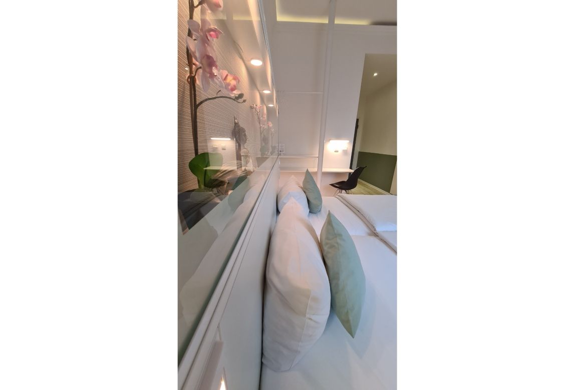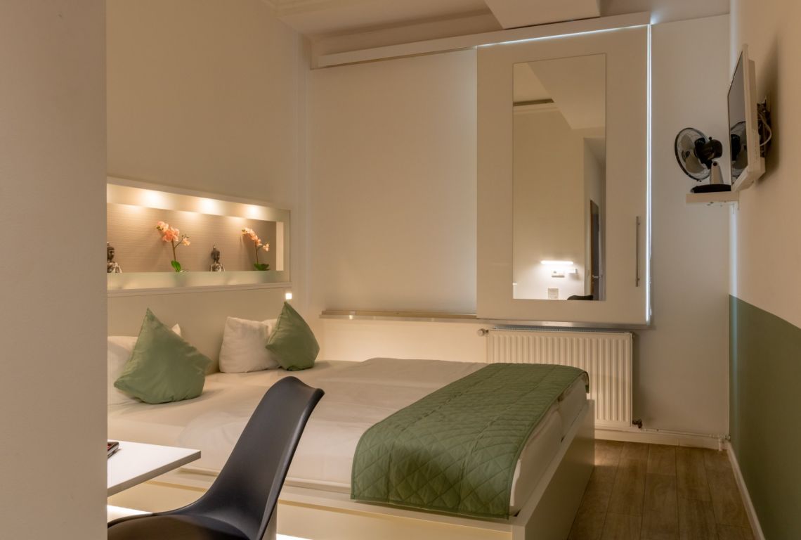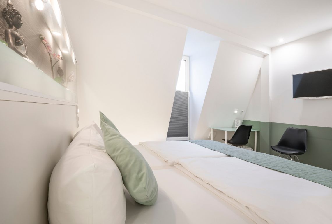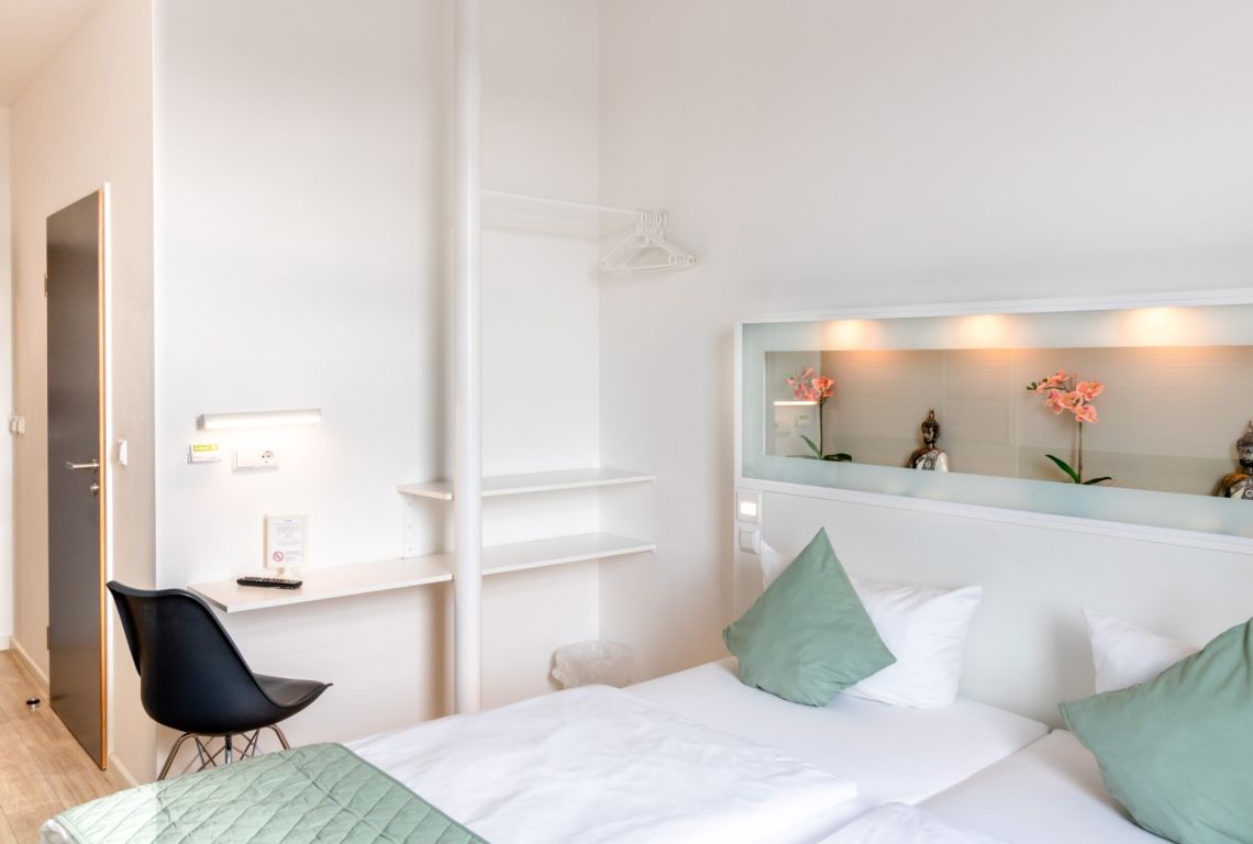 Das stimmige Farbkonzept – frisches Grün und klares Weiß – in den Zimmern sorgt für eine ruhige und